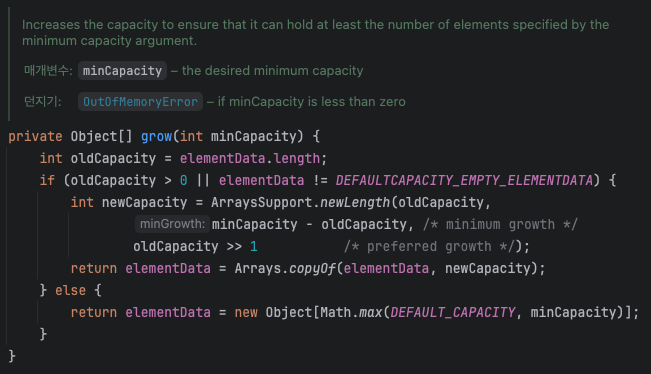 - 기본 크기(DEFAULT_CAPACITY, 보통 10) 또는 minCapacity 중 큰 값으로 배열을 새로 생성 한다.