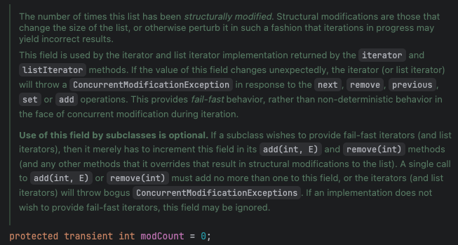 - modCount는 ArrayList의 구조적 변경 횟수를 기록하는 필드 값이다.