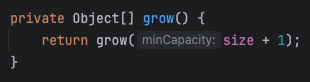 grow() 메서드가 호출되면 그 안에서 또 grow 메서드가 호출이 되는데 파라미터 값으로 size + 1를 줬다.